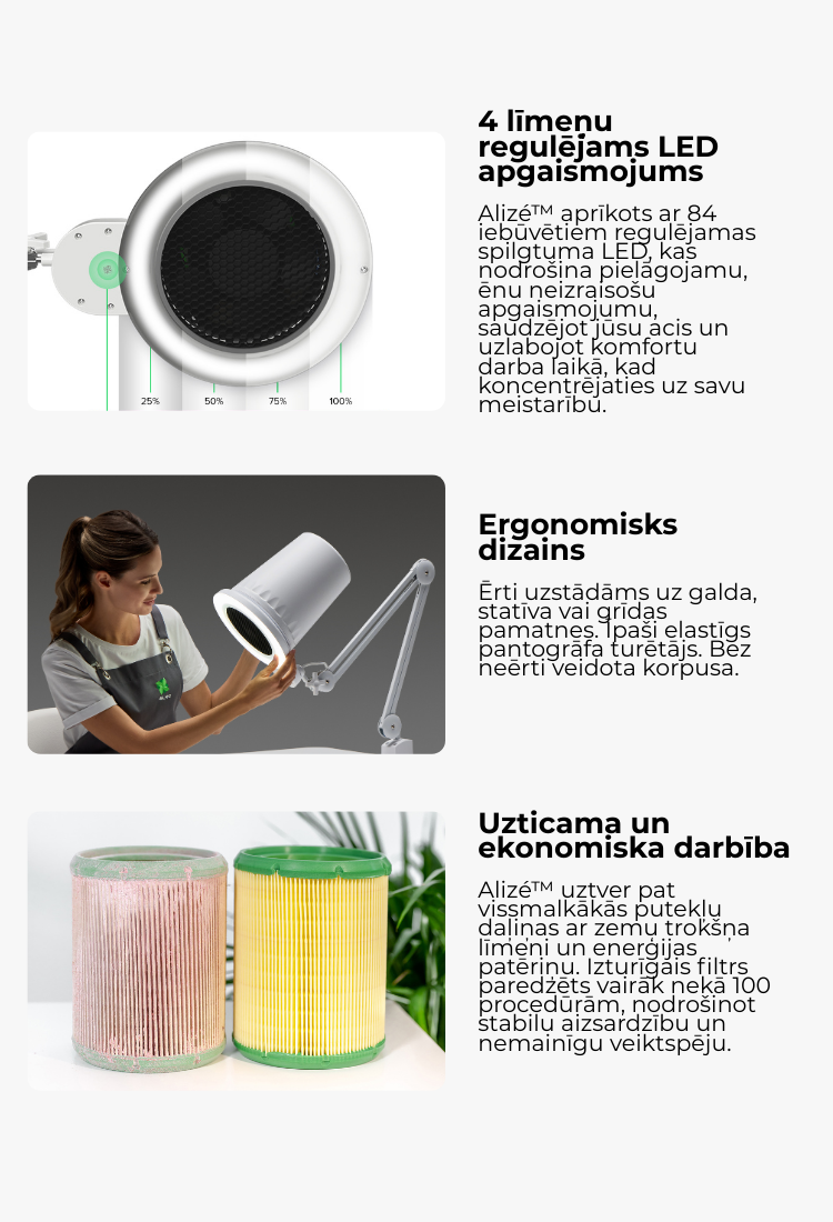 Plaša funkcionalitāte: pedikīrs, manikīrs, podoloģija, zobārstniecība un protezēšana. 4BLANC Alizé nagu putekļu sūcējs ir ideāli piemērots profesionāliem iestatījumiem un ir būtisks nagu tehniķiem, kuri strādā no mājām.