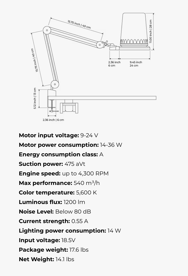 - Motor power consumption: 40 W