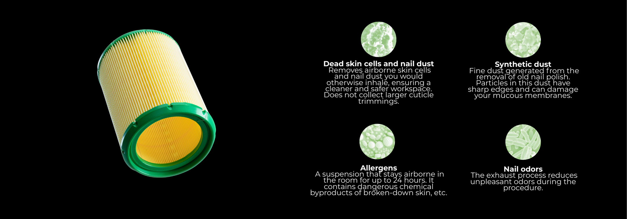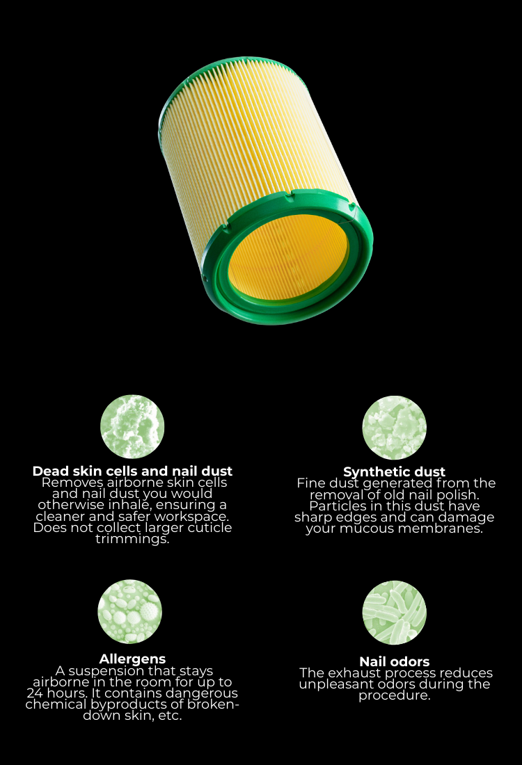 During manicure and pedicure procedures, especially with drill bits, a significant amount of fine dust is generated. The main risk is that the dust enters the mucous membranes and lungs. This causes allergies and other serious, often chronic respiratory diseases. Therefore, working without air cleaning equipment is not safe. The 4BLANC nail dust collector doesn't just collect cuticle remnants; it completely removes any bio-materials that you would otherwise inhale.