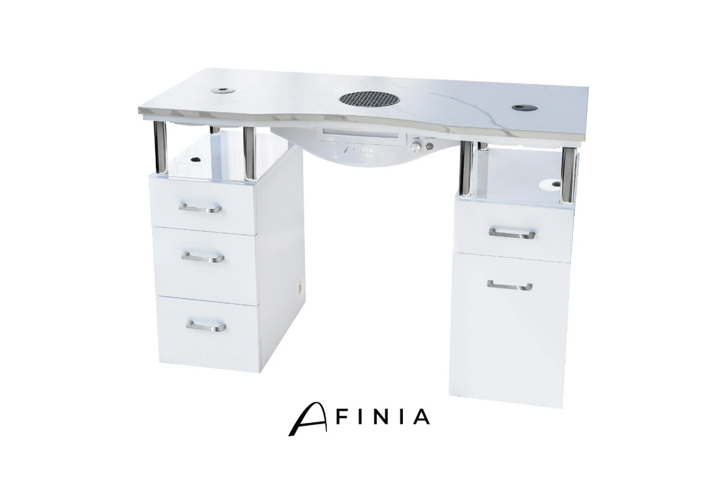 The Afinia Basic Quartz Sintered Cosmetic Desk is a functional and aesthetic solution for professional beauty spaces. Its simple and universal design offers ample storage with 5 drawers. The sintered quartz countertop guarantees unmatched durability and strength, significantly surpassing granite properties. This material is highly resistant to mechanical damage, making it extremely difficult to permanently damage. As a result, the Afinia Basic desk is not only visually appealing but also a reliable long-term solution for any beauty salon.