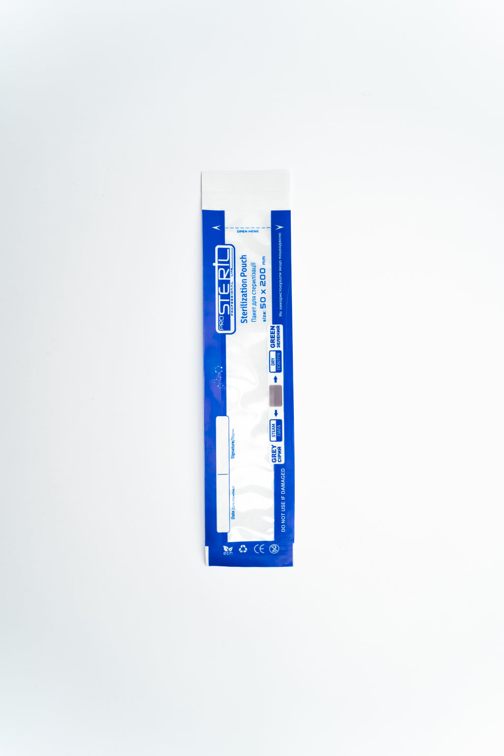 - Pre-applied sterilization indicator (Class 4), which easily indicates whether sterilization has been properly performed. If the sterilizer works correctly, the indicator changes color (e.g., from beige to purple).