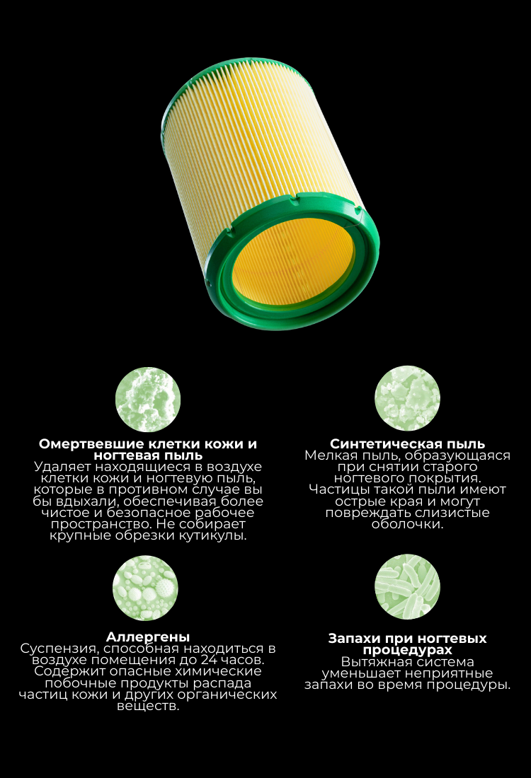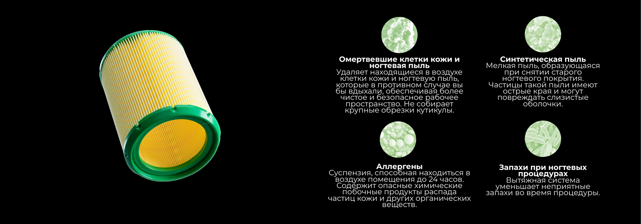 Во время процедур маникюра и педикюра, особенно с фрезами, образуется большое количество мелкой пыли. Основная угроза заключается в том, что пыль попадает в слизистые оболочки и легкие. Это вызывает аллергию и другие серьезные, часто хронические заболевания дыхательных путей. Поэтому нельзя работать без оборудования для очистки воздуха. Пылесос 4BLANC для ногтей не просто собирает остатки кутикулы, а полностью удаляет любые биоматериалы, которые вы могли бы вдыхать.