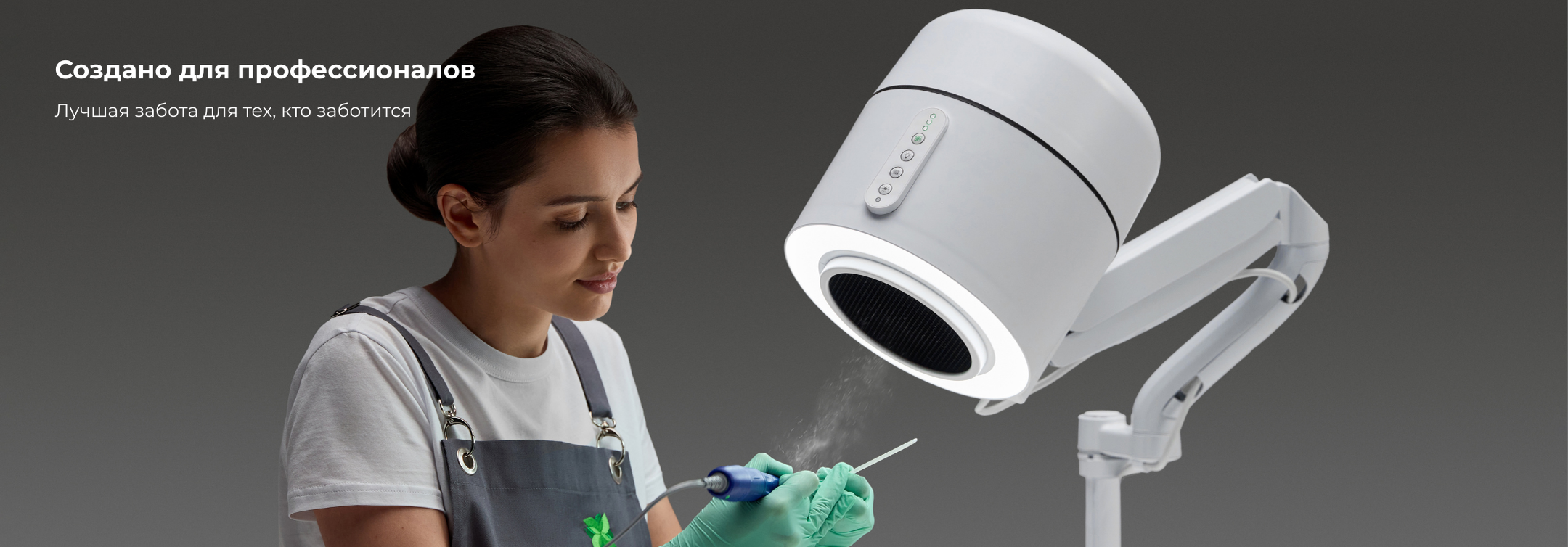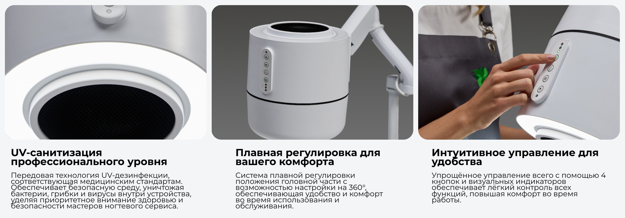 - Дизайн: Цилиндрический эргономичный корпус для интуитивно понятной/легкой работы; управляющие устройства на корпусе (с учетом работы в перчатках), удобное размещение на шарнирном рычаге противовеса для легкой регулировки угла для лучшего всасывания и света, система крепления на столе требует всего 10 см² рабочего места (станция для маникюра), дополнительное крепление на подвижной подставке для перемещения (станция для педикюра).