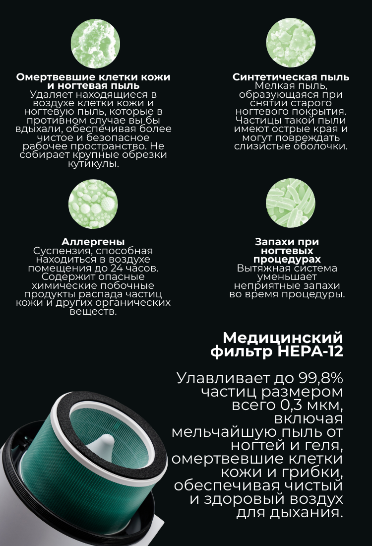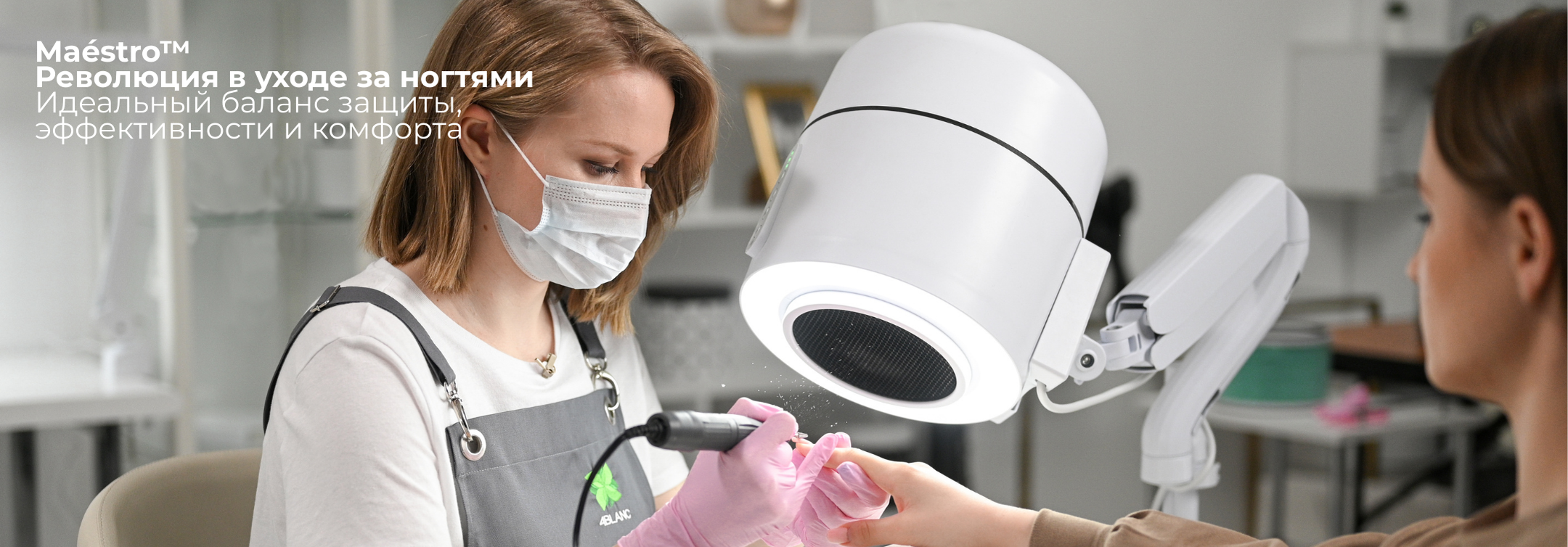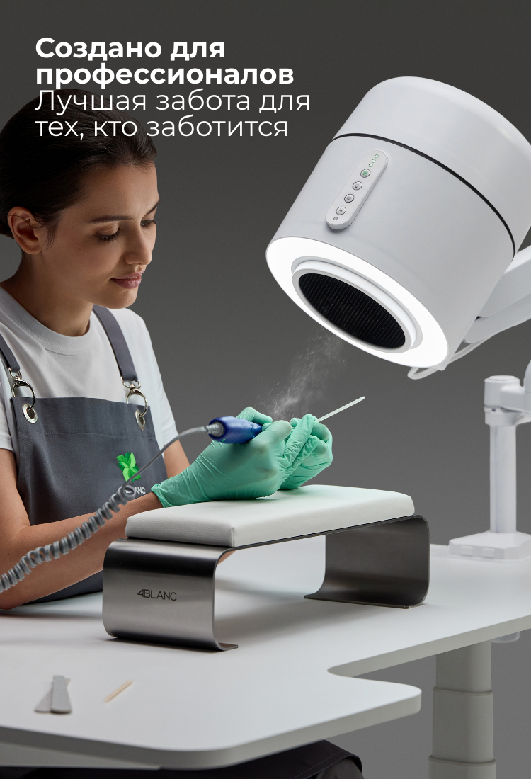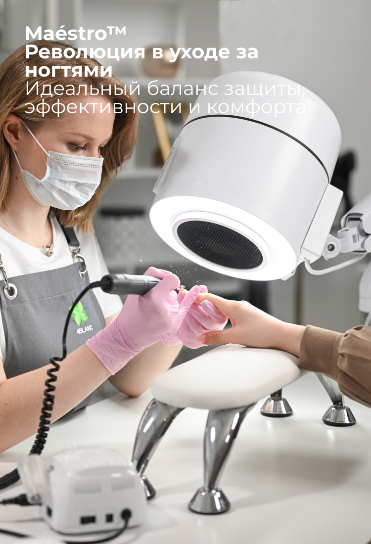 Maestro Ultimate Protection Nail Station от 4BLANC® уникально сочетает эффективность с защитой здоровья для мастеров и клиентов. Компактное устройство включает встроенный пылесос, регулируемое освещение и UV-дезинфекцию. Сохранение здоровья и комфорта рабочего пространства во время длительных процедур маникюра/педикюра, обеспечивая более безопасную и эффективную рабочую среду. Maestro обеспечивает несравненную чистоту рабочего места и безопасность дыхания благодаря системе циклонного сбора пыли, фильтрации воздуха HEPA12, которая захватывает 99,7% микрочастиц, и UV-дезинфекции, чтобы устранить постоянные патогены. Гибкие варианты крепления и высокая мощность всасывания определяют уникальную универсальность Maestro, используя процедуры ухода за ногтями и стопами Smart-Disc в маникюре и педикюре/подиатрии. Преимущества включают снижение профессиональных рисков для здоровья (особенно: заболевания легких, развитие аллергий, заболевания глаз), значительное улучшение комфорта работы мастеров ногтевого сервиса при экономии рабочего пространства. Maestro снижает уровень шума, не снижая мощности всасывания, улучшает комфорт клиентов и, таким образом, повышает общую эффективность, производительность и удовлетворенность каждой процедуры.