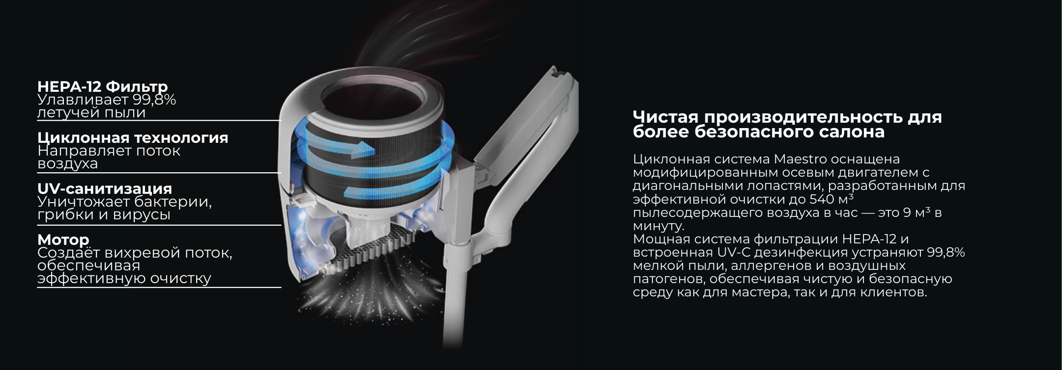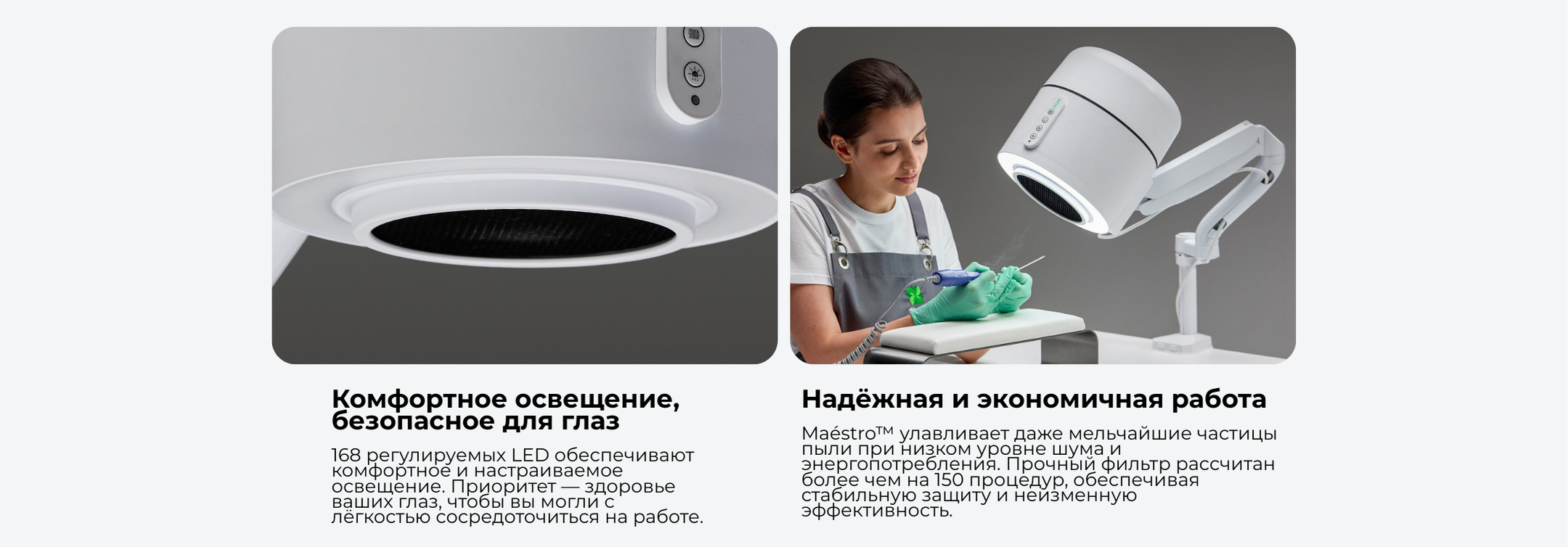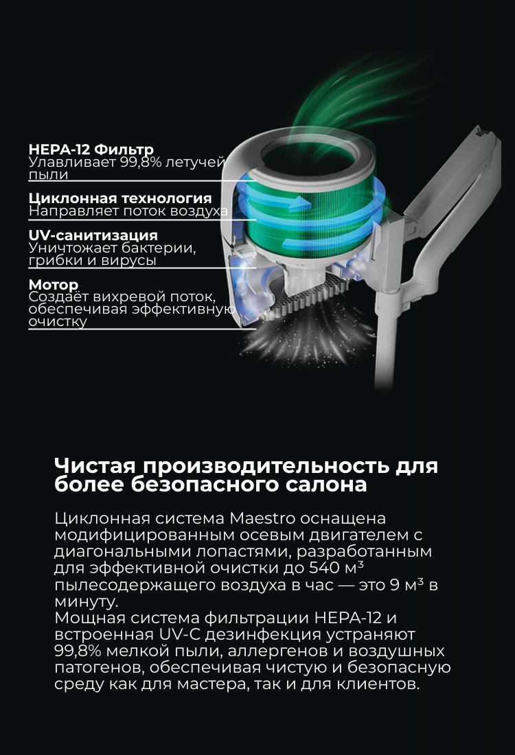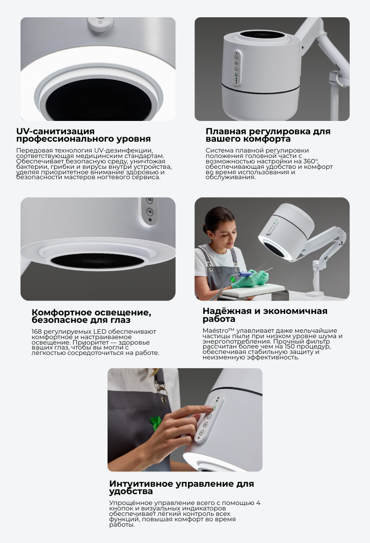 Maestro – это инновационное, универсальное решение для ногтевого салона, которое акцентирует внимание на защите здоровья и благополучии на рабочем месте. Оно предлагает высокую эффективность при низком энергопотреблении, интегрируя несколько функций и адаптивность. Функции включают мощный пылесос для ногтей, геля и кожных частиц с отличной силой всасывания и низким уровнем шума, систему фильтрации воздуха HEPA-12 для задержания самых мелких частиц пыли и запахов, UV-дезинфекцию, регулируемое кольцевое освещение для комфортного освещения, защитную систему для новичков и гибкую систему креплений для различных процедур. Maestro создает более безопасную и универсальную среду для мастеров ногтевого сервиса и клиентов, улучшая качество обслуживания и безопасность.