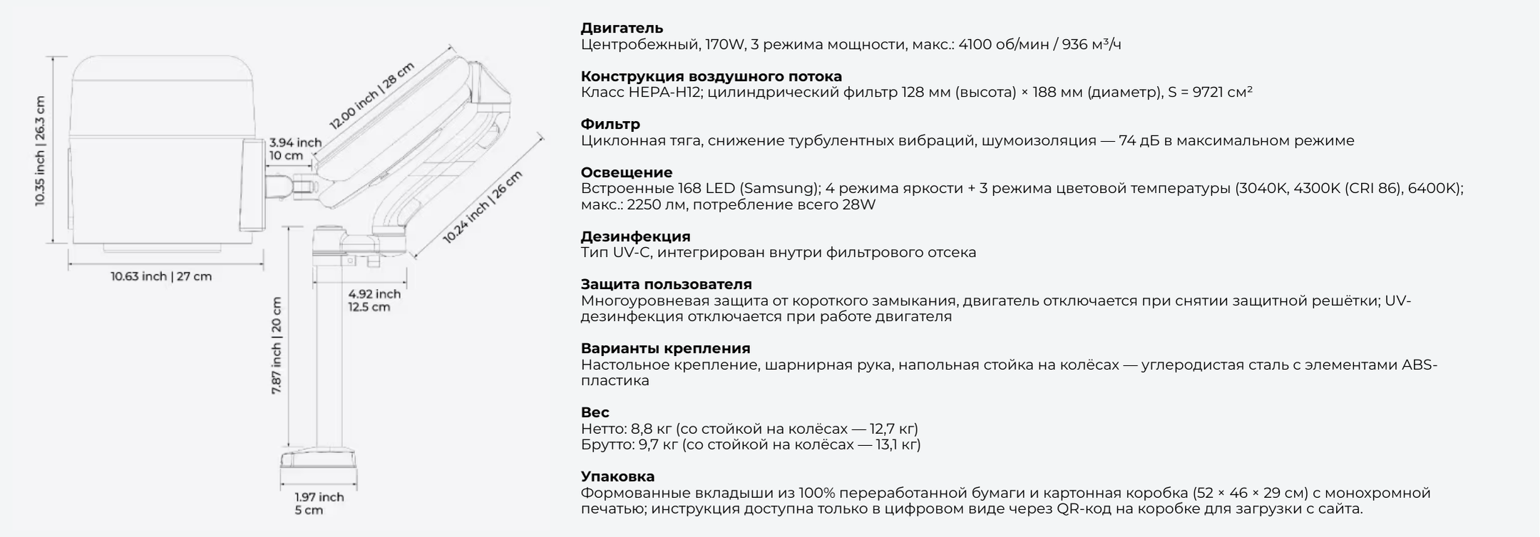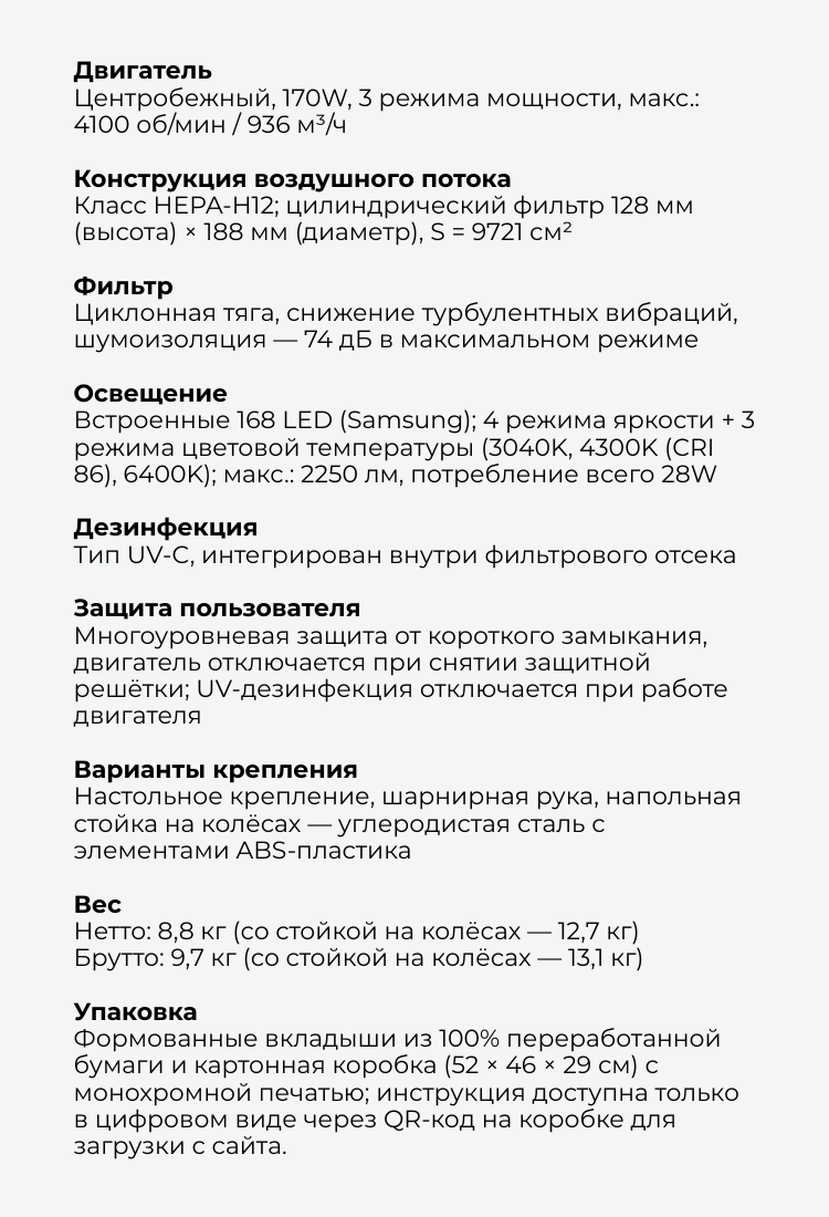 - Основная защита пользователя: Многоуровневая защита от короткого замыкания, двигатель отключается при снятии защитной решетки, UV-дезинфекция останавливается, когда двигатель включен.